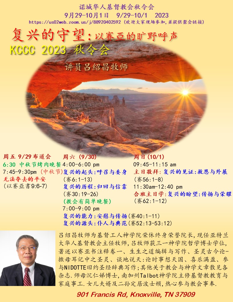 - 09/30/23 周六 16:00-21:00 培靈會 - 復興的守望:以賽亞的曠野呼聲(教會提供晚餐)